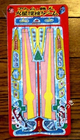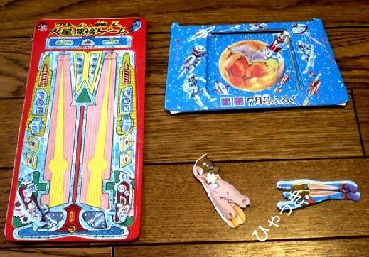 アトム、鉄人の貴重な紙製人形がついている。輪ゴムでアトムや鉄人を発射し的に当てるというもの。的には確かに火星が描かれている。
