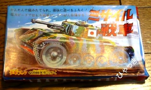 | 集英社から出ていた少年ブック昭和40年9月号の付録です。 一応、ビッグXのシールだけがちょっと手塚関連ですが、なんといっても主役はミサイル自爆戦車です。 これは、ゴム動力で走る紙製の戦車が、何かに当たると自爆するというものです。とても平和な戦車ですね。 |