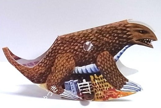 | 紙袋に入った怪獣のセット。すでに紹介している立体カラーテレビと同じ昭和42年新年特大号の付録。この号の付録はとても豪華でお得でしたね。 全体的にはマグマ大使の怪獣が多いのですが、何故かガメラが入っていたり、袋の絵にはバルゴン似の怪獣が描かれていたりしています。 |