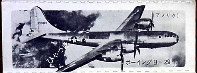 | 太平洋戦争カードが袋に同封されていた。昭和30年代は、少年雑誌に戦記物が多く採り上げられ、戦闘機、戦車、戦艦などの紹介に多くの頁が割かれていた。 |