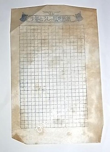 | 少年とうしゃ版は、いわゆるガリ版の付録。とうしゃ版と原紙に情報を書く時に下敷として使うやすり台と原紙が入っていた。ガリ版は学校などで良く使われていたが普通の家庭にあるものではなく、当時の子供には高級感がある付録だったと思う。 この付録で注目すべきは、袋、インク塗布用ブレードに連載が開始されたばかりの「アトム大使」に登場するケン一少年や宇宙艇のイラストが描かれていることである。((d)、(e)ご参照方)アトム大使の連載開始は昭和26年4月で、まだ、アトムが登場していない頃の貴重なイラストである。 連載が始まったばかりにもかかわらず早くも付録のイラストに採用されたのは、新進気鋭の手塚先生への期待を示しているように思う。 |