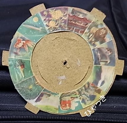 円盤のもう一つの側には、生き物、風景、乗り物などのイラストが描かれていた。