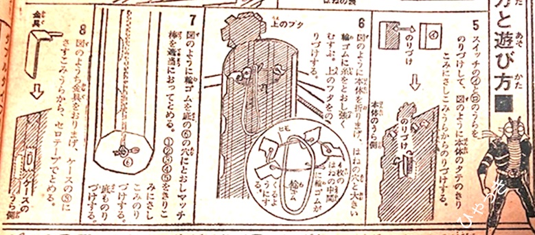 | 仮面ライダーV3放映時の付録。 変身ベルトの紙製付録は大変貴重です。「ホッパー」はV3が用いる道具で、空を飛んで探索をするというもの。 このHPで紹介している付録としては新しい方ですが、昭和48年の付録なので、なんと50年くらい前のものなんですね。大切にしないといけませんね。 |