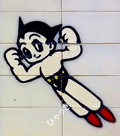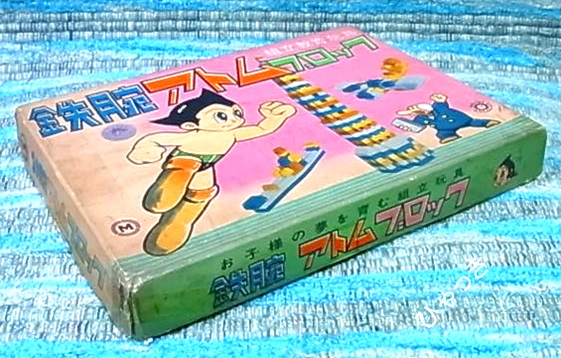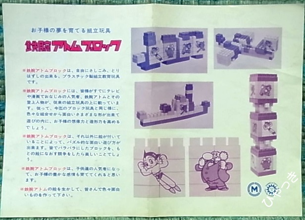 | 三浦トーイが販売したアトムのブロック。 ブロックを揃えるとアトム、お茶の水博士、ヒゲおやじ、タワシ警部の絵が出来上がるが、残りのブロックが少なくなってしまう。下に示したサンプルのような作品を作るには、さらにブロックを買い足さないといけないが、そこまでする親はいなかったのでは? |
