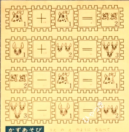 | ジャングル大帝数字ブロック(アート玩具) ブロックを組み合わせていろいろな造形を楽しむ「くみたてあそび」((V)(W)ご参照方)と、(q)〜(t)の数字ブッロックと(u)のプラス、マスナス、イコールのブロックで計算の基礎を学ぶ「すうじあそび」((x)ご参照方)ができる。 アート玩具という会社は今はないようだ。 |