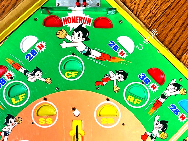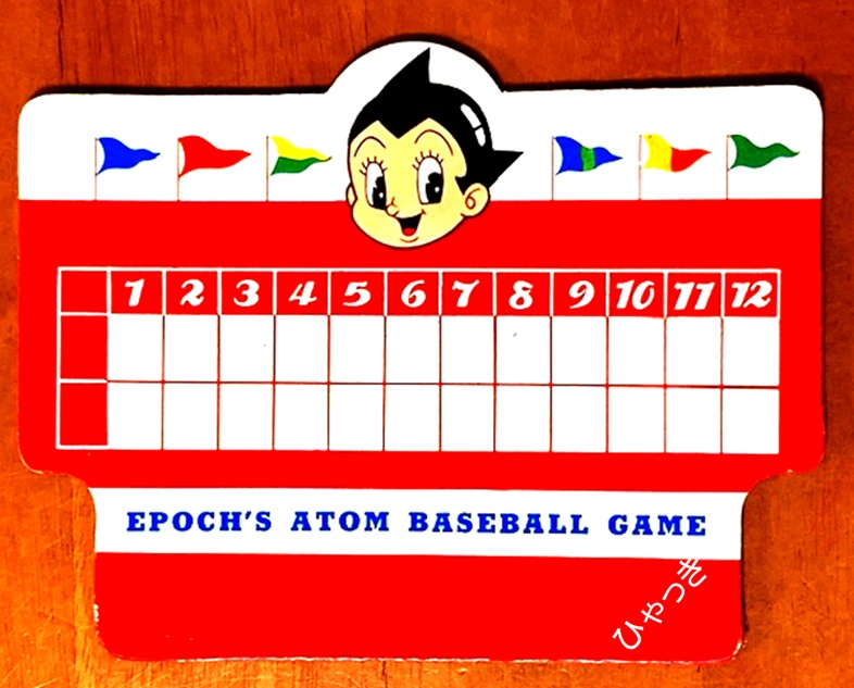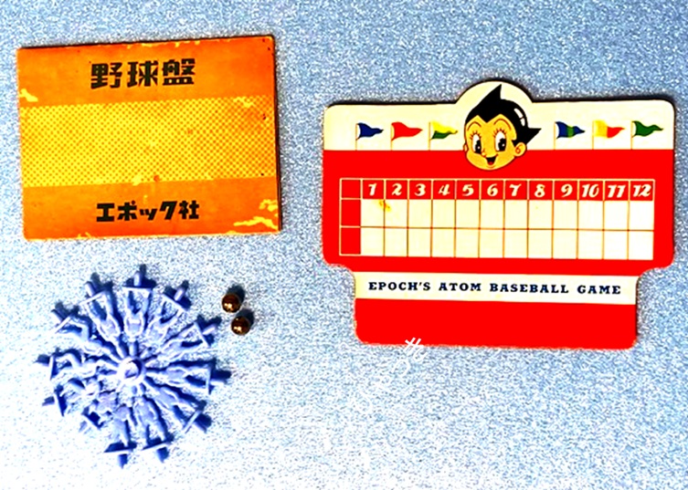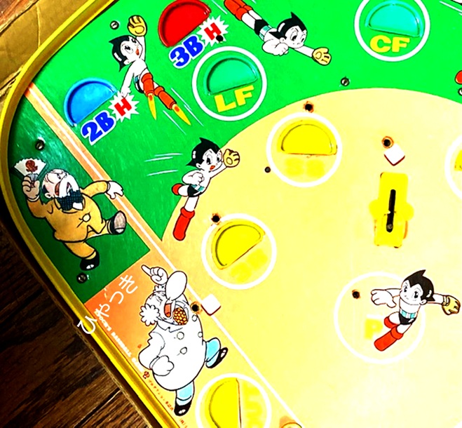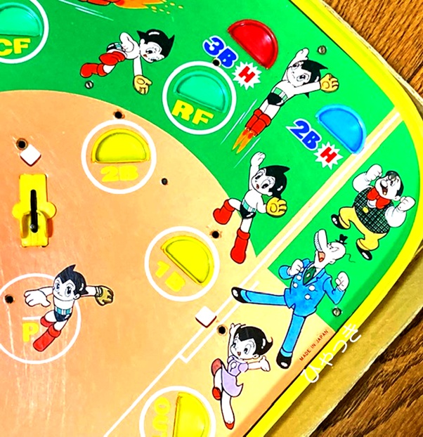 鉄腕アトムに登場するキャラクターがたくさん描かれた「アトム野球盤」です。フィールド内に8種類のポーズをとったアトム、ファールグラウンドにウラン、アトムのお父さん、お茶の水博士、ヒゲおやじ、田鷲警部が描かれています。
