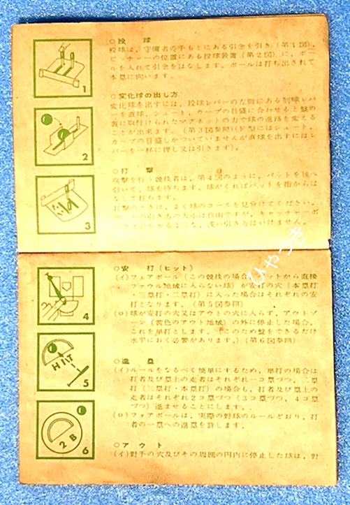 野球盤は現在に至るまで色々と進化していますが、この時代は磁石で鉄球の進路を曲げてカーブ、シュートを実現する仕掛だけ組み込まれています。私の家にもあったんですが、結構盛り上がりました。