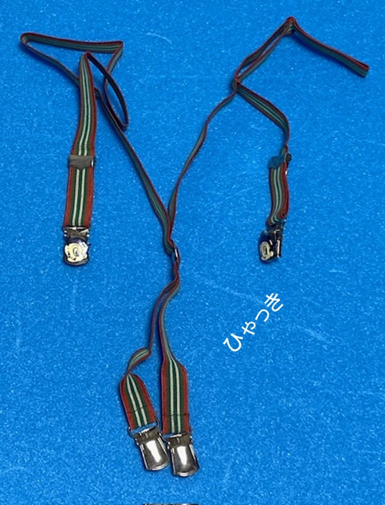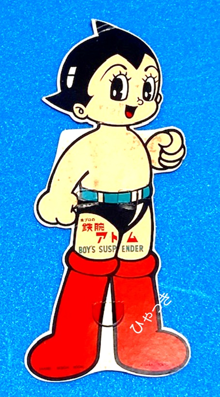 | 商品名「鉄腕アトムサスペンダー」。(SANREI DESIGN ROOM) サスペンダーとは、いわゆるズボン吊りの事です。ベルトが使えないくらい小さな子がよく使いました。何となくおしゃれな感じでしたね。 下のようにアトムに装着して売られていたようです。アトムのパンツにはサスペンダーが必要ないのですが、とてもカッコ良いので、これを見た子供達は「僕も着けたい!」と思ったでしょう。 アトムの足元に「SANREI DESIGN ROOM」というロゴが印刷されています。製造元かもしれませんが、今はこの名前の会社は見当たりません。 |