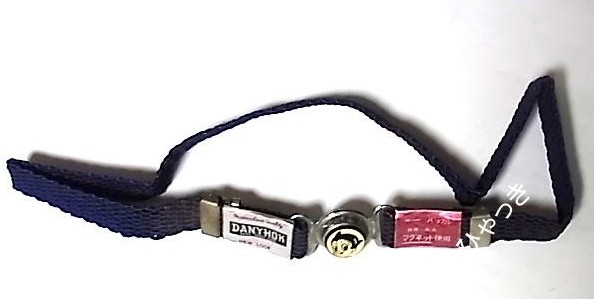 | 商品名「アトムマグネットベルト」。(カワムラ) バックルの部分が磁石で結合する仕掛けのベルト。 使われているアトムのプレートは、上で紹介しているサスペンダーのものと同じ。ということは、上のサスペンダーもカワムラ製かもしれない。 |