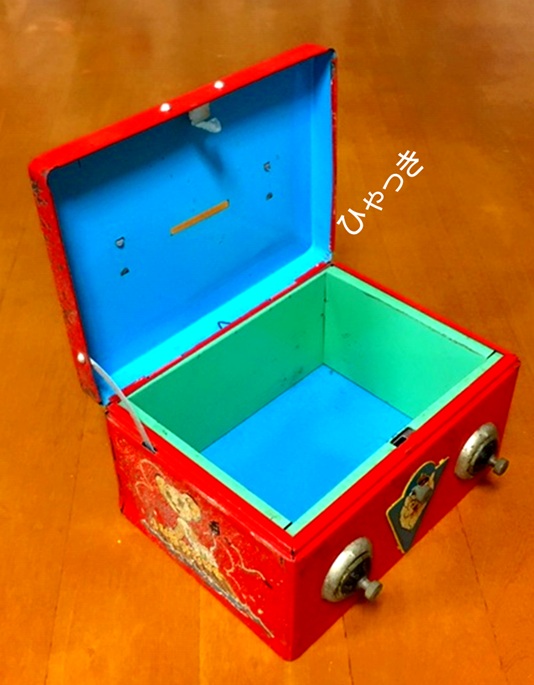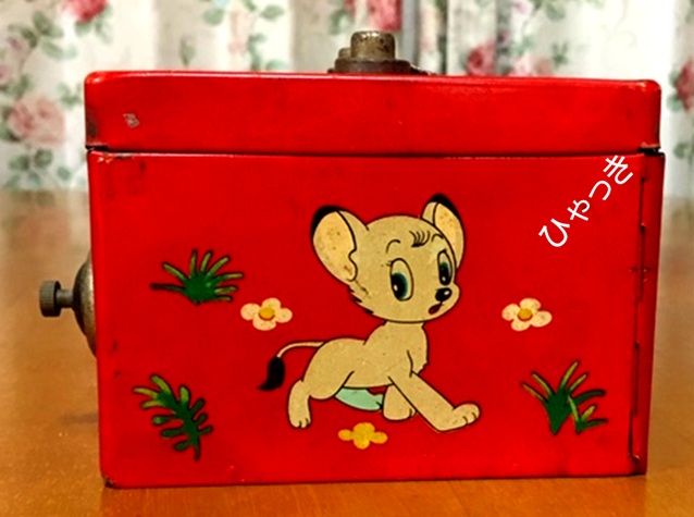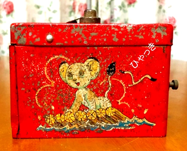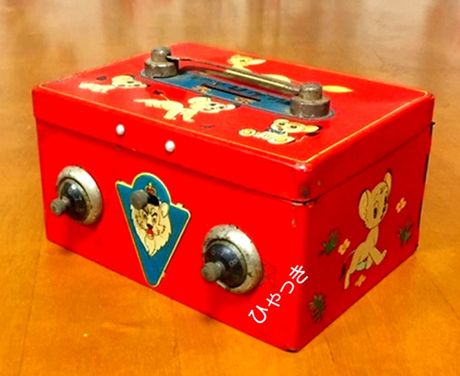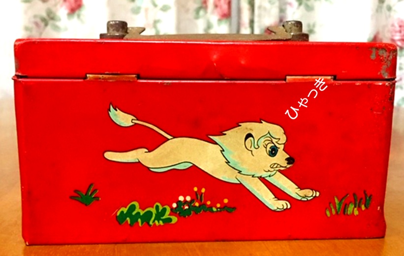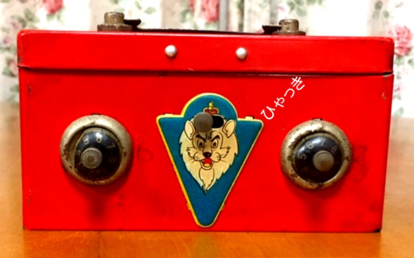 ジャングル大帝金庫(メーカー不明) ジャングル大帝のブリキ製金庫です。ジャングル大帝と言っても、描かれているのはほとんどレオだけです。全体の雰囲気から、たてがみのある姿は大人になったレオだと思います。 トレードマークが無いので製造元がわかりませんが、すでに紹介したビッグXの金庫とは構造が異なるので、メーカーは高徳ではないと思います。また、版権シールの痕がないので、無版権のパチ物の可能性があります。 すでに売られていた金庫に、レオを印刷したのかもしれません。