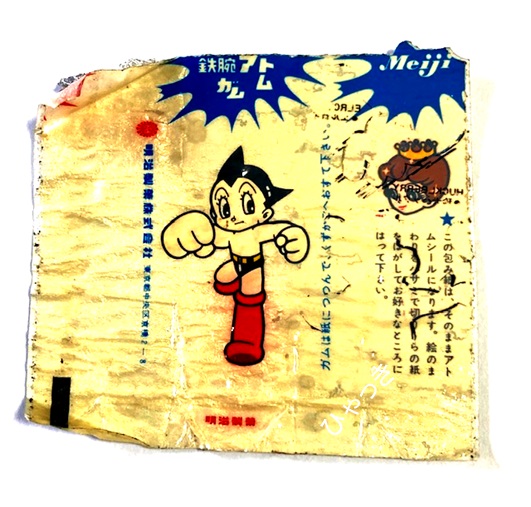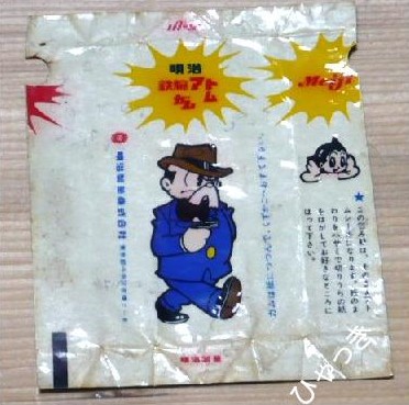 | 鉄腕アトムガムのガムさやです。 実際中に入っているガムは銀紙で包まれ、さらにその上からガムさやでパッケージされていました。 噛んだ後ガムを包むための紙です。 色違い3種が確認されています。 このようなとるに足らなさそうなものが、案外入手困難アイテムになることもよくあります。 |
