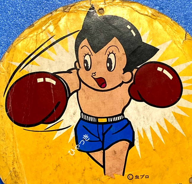 古谷製菓まんがパレードシリーズの販促ディスプレイの円形パネルです。一方にアトム、その反対側に悟空とマグマ大使が描かれています。